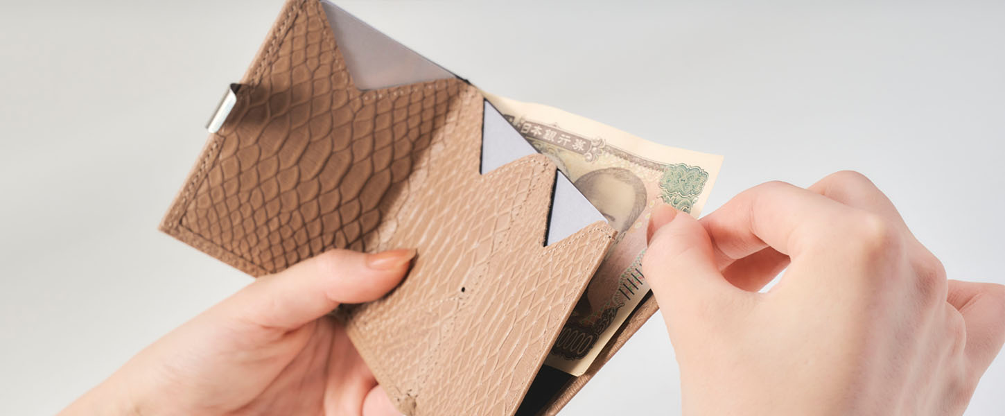 さらにこのステンレス板は電波の侵入を防御するという複合的な役割を果たしています。複数のカードを干渉しないように区別されたポケットに収納でき、カードの壁によって遮蔽された隙間に紙幣を挟み込む効率的な設計コンセプトです。